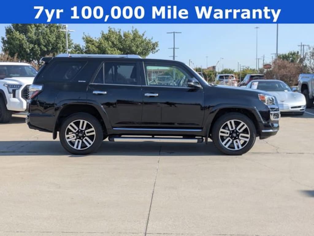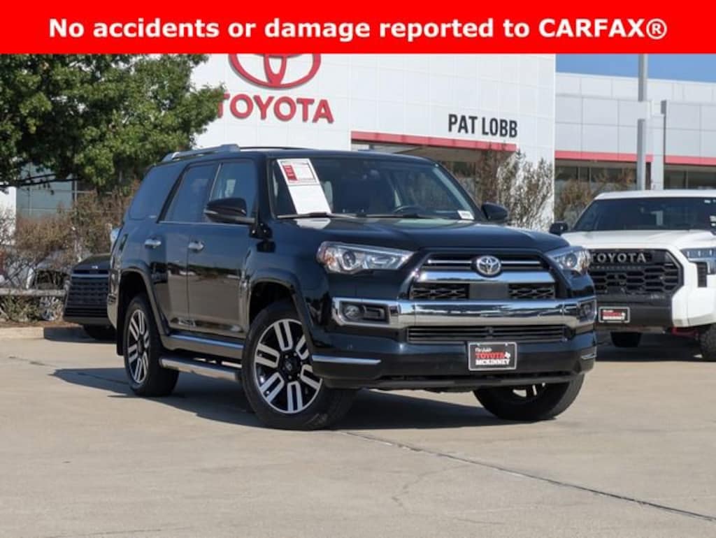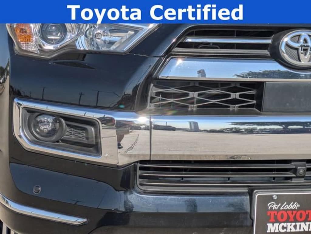 At Pat Lobb's Toyota of McKinney, buying a car is as easy as 1-2-3! We have been serving McKinney, Texas for several years! We invite our neighbors of Allen, Plano, Richardson, Dallas, Prosper, The Colony, Frisco and beyond for the best service, selection and deals in the D/FW area! Limited Package (Dual Zone Auto Climate Control, Garage Door Opener, Heated Outside Rear-View Mirrors, Moonroof w/Tilt Up & Slide, Panoramic Back Monitor, and Silver Roof Rails), Wilderness Package (PPO) (TMS), 4Runner Limited, Toyota Gold Certified Certified, 4D Sport Utility, 4.0L V6 DOHC 24V, 5-Speed with ECT, 4WD, Midnight Black, Graphite Leather, 15 Speakers, 3.727 Axle Ratio, 4-Wheel Disc Brakes, ABS brakes, Air Conditioning, Alloy wheels, AM/FM radio: SiriusXM, Anti-whiplash front head restraints, Apple CarPlay/Android Auto, Auto High-beam Headlights, Auto-dimming Rear-View mirror, Automatic temperature control, Brake assist, Bumpers: body-color, Cargo Cover (PPO) (TMS), Cargo Tote (PPO) (TMS), Carpet Floor Mats/Cargo Mat (PPO) (TMS), Coin Holder/Ashtray Cup (PPO) (TMS), Compass, Dashcam (PPO) (TMS), Delay-off headlights, Door Edge Guards (PPO) (TMS), Driver door bin, Driver vanity mirror, Dual front impact airbags, Dual front side impact airbags, Electronic Stability Control, Emergency Assistance Kit (PPO) (TMS), Emergency communication system: Safety Connect (1-year trial), Front anti-roll bar, Front Bucket Seats, Front Center Armrest, Front dual zone A/C, Front fog lights, Front reading lights, Front wheel independent suspension, Fully automatic headlights, Garage door transmitter: HomeLink, Heated & Ventilated Front Bucket Seats, Heated door mirrors, Heated front seats, High Performance Black LED Fog Lights (PPO) (TMS), Illuminated entry, Knee airbag, Leather Seat Trim, Low tire pressure warning, Memory seat, Mudguards (PPO) (TMS), Navigation System, Outside temperature display, Overhead airbag, Overhead console, Paint Protection Film (PPO) (TMS), Panic alarm, Passenger Airbag Sensor, Passenger door bin, Passenger vanity mirror, Power door mirrors, Power driver seat, Power moonroof, Power passenger seat, Power steering, Power windows, Radio: Premium Audio w/JBL, Rear anti-roll bar, Rear seat center