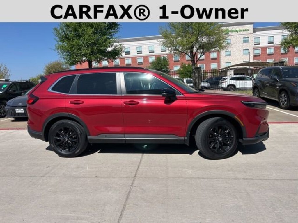 The exterior of this CR-V Hybrid Sport-L is adorned in a stunning Red color, further accentuated by the alloy wheels and premium touches that give it a refined and sophisticated appearance. Step inside, and you'll be greeted by a spacious and well-appointed cabin, featuring leather-trimmed seats, a premium audio system, and a host of advanced technology features, including wireless Apple CarPlay and Android Auto integration.